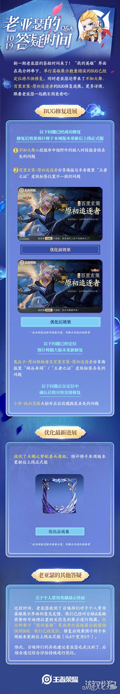 小狐狸吃鸡腿去了,亚某人就带着新一期的#老亚瑟的答疑时间#先来代班了 本期亚某人带来了不知火舞&“我的英雄”展示界面BUG修复~ 另外,召唤师们对于个人常用英雄展示界面的其他反馈,老亚瑟也在持续关注中,预计将通过综合评估进行后续优化 更多详情,跟着老亚瑟一起戳长图查看吧▼
