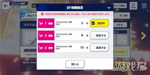 玩过es1的玩家都知道es1很容易升级,活动期间升级就可以回复全部的体力,不过es2前期虽然升级快,但是后期升级要求会越来越高,所以如果可以的话我们要尽量珍惜我们的体力,在打歌界面我们可以调整BP的单次消耗,BP消耗的越多单次奖励越多,但是BP的性价比会降低,所以可以的话,我们尽量不要选择太高的单次消耗,能多赚点是一点嘛。