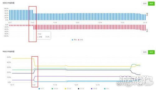 我们选取某个播主,发现他在11.2号账号粉丝的性别和年龄分布情况都发生了明显的变化,女粉突然变多,而且每个年龄段的粉丝占比也发生了改变。