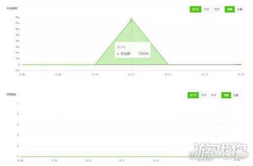 可以查看账号的粉丝增长趋势和点赞趋势,我们发现这个账号近7天没有点赞数据的变化,粉丝数却在1.11号突然增加了近76万。