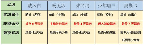 戴沐白:戴沐白是一个可以用到毕业的坦克武魂,首充6元就能获得,他的强势之处主要来源于他的武魂技能,战斗中可以给自己添加一个可以抵抗大量伤害的护盾,还有给全队加攻击buff,本身血高防厚,实乃前排必备。