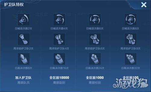 鹰眼大将的权益是每天喊话的次数8次,每周求助护卫队的次数8次,每日裁决的次数有32次。