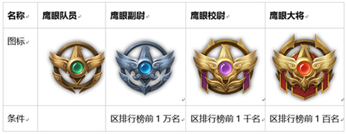 等级分别是区排行榜达到前一万名,区排行榜前一千名,区排行榜前一百名。也就是说鹰眼大将需要全区前100的玩家才可以获得。