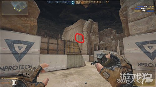 地图中央有一堵梯形的墙壁挡住了去路,双方很容易在这个位置僵持不下,此时就要用一颗手雷打破这个局面。朝墙上红圈处掷出手雷,可以利用手雷反弹原理攻击到墙后的敌人。