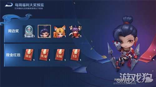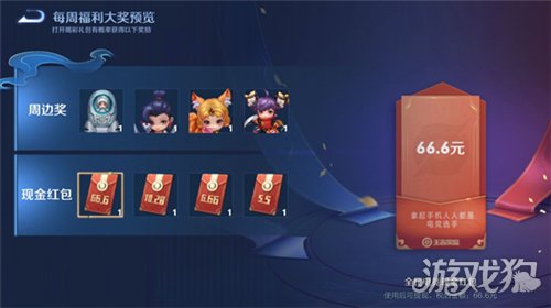 开启电竞喝彩礼包,有机会获得:随机金额现金红包(最高66.6元)、多种周边手办、随机数量电竞豆等;大奖详情请在每周福利-大奖模块查看。