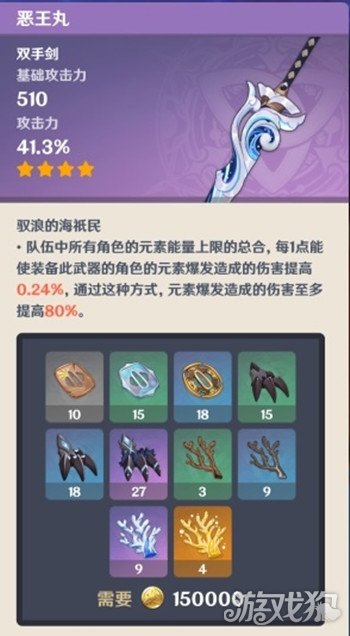 原神恶王丸是一款四星级的双手剑,适合优菈、迪卢克、大招流辛焱、渡火核爆流重云使用,其属性如下: