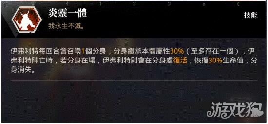 第一种用法是伊弗利特在场上时,分身形同多一个占位,也就是多一个坦在场上,这个是最常用到的功能,但由于分身只有继承到30%的素质,所以其实分身被打到算容易挂,主要是分散敌人火力使用。推荐和苍影一起使用,增加场上分身数量。