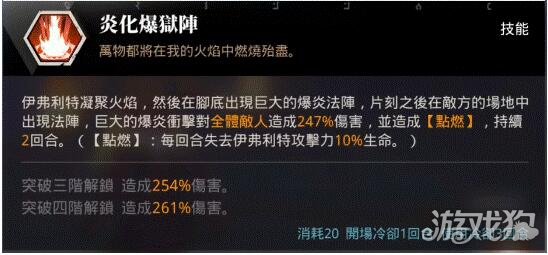 全体2.47倍伤,持续【点燃】2回合,敌人每回合失去攻击10%血。