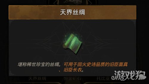 【天界丝绸】作用介绍:堪称稀世珍宝的丝绸,可以用于回火史诗品质的旧臣面具、旧臣长衣。