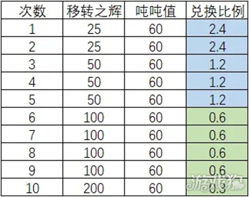具体移转之辉与吨吨值兑换比例如下: