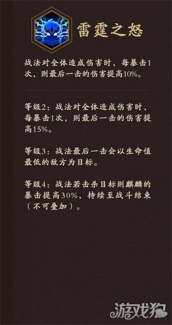 等级4:战法若击杀目标则麒麟的暴击提高30%,持续至战斗结束(不可叠加)。