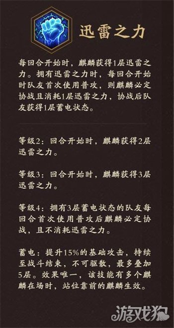 每回合开始时,麒麟获得1层迅雷之力。拥有迅雷之力时,每回合开始时队友首次使用普攻,则麒麟必定协战且消耗1层迅雷之力,协战后队友获得1层蓄电状态。