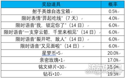 2.活动奖励:开启无尽星芒的幸运礼,有概率获得射手英雄自选宝箱、限时语音、限时表情、星梦币等奖励;拥有后羿-无尽星芒还可解锁额外奖励:星梦币*20及限时语音:我锁定你了(14日);