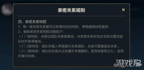 (1)1级特权:非排位组队共享英雄池。与亲密关系好友在非排位模式组队时共享英雄池