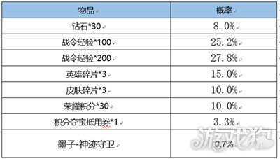 打开可随机获得以下奖励之一:墨子-神迹守卫、积分夺宝抵用券*1、英雄碎片*3、皮肤碎片*3、荣耀积分*30、100/200战令经验、钻石*30。