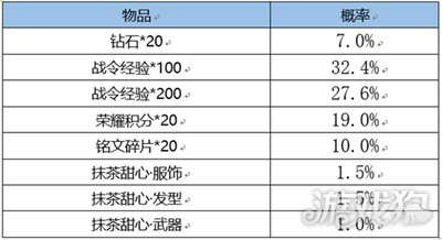 打开可随机获得以下奖励之一:抹茶甜心·发型、抹茶甜心·服饰、抹茶甜心·武器、荣耀积分*20、100/200战令经验、钻石*20、铭文碎片*20。