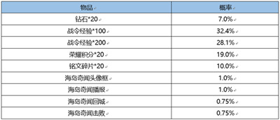 打开可随机获得以下奖励之一:海岛奇闻头像框、海岛奇闻播报、海岛奇闻回城、海岛奇闻击败、荣耀积分*20、100/200战令经验、钻石*20、铭文碎片*20。