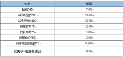 打开可随机获得以下奖励之一:老夫子-航海奇遇记、积分夺宝抵用券*1、英雄碎片*5、皮肤碎片*5、荣耀积分*50、200/400战令经验、钻石*40。