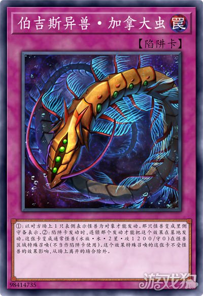 ①:以对方场上1只表侧表示怪兽为对象才能发动。那只怪兽变成里侧守备表示。②:陷阱卡发动时,连锁那个发动才能把这个效果在墓地发动。这张卡变成通常怪兽(水族·水·2星·攻1200/守0)在怪兽区域特殊召唤(不当作陷阱卡使用)。这个效果特殊召唤的这张卡不受怪兽的效果影响,从场上离开的场合除外。
