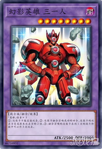 ①:这张卡不能直接攻击。②:这张卡融合召唤成功的回合,这张卡的攻击力变成原本攻击力的2倍。③:融合召唤的这张卡在同1次的战斗阶段中可以作3次攻击。