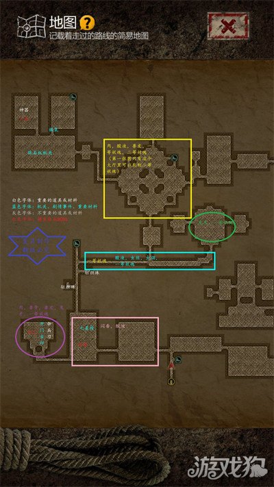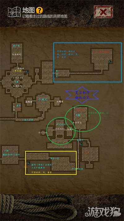 如果中途休息,一定要买到路线图去挂机探索,商人处优先买火油,盐,朱砂,基础材料后面的话会越来越富余。 下面详细说明下地图的各个信息: