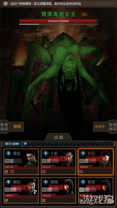 这个怪就一个技能:青黑血齿,技能伤害很高,基本一下一个小朋友,所幸速度并不快,另外这怪闪避很高,所以打法不难,日天技能断筋,然后小哥技能输出,打这个感觉比较看人品,开始的时候脸黑一直miss断筋死活出不来或者一上来把日天或小哥秒了的话就可以放弃了。日常嗑药还是要的,不然伤害可能会不够。