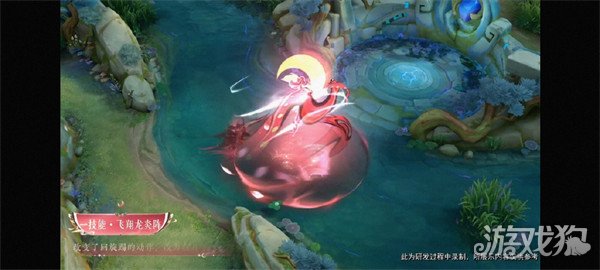 二技能从扇中掷出一轮旋转的弯月,飞行的同时周围包裹妖力气旋;