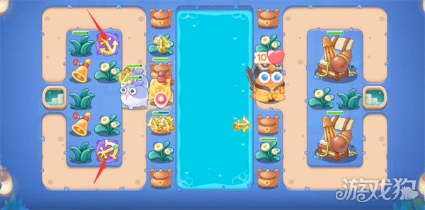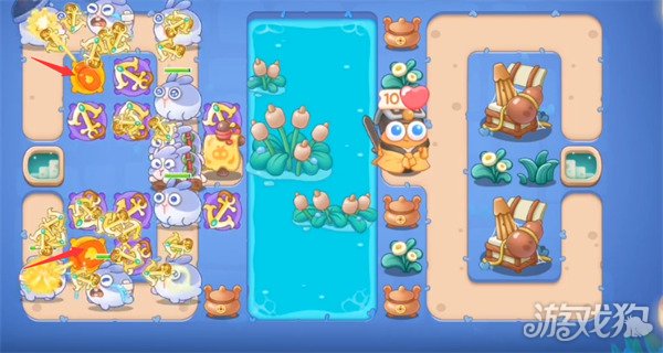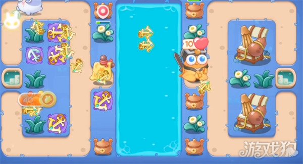 1开局如图所示位置放置两个船锚,并将船锚升至2级,利用船锚的分裂攻击可以更高效率的清理附近的障碍物