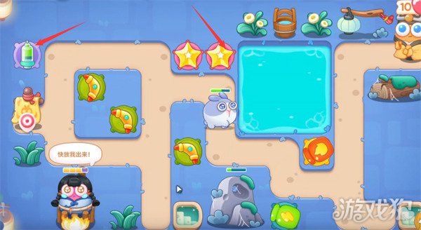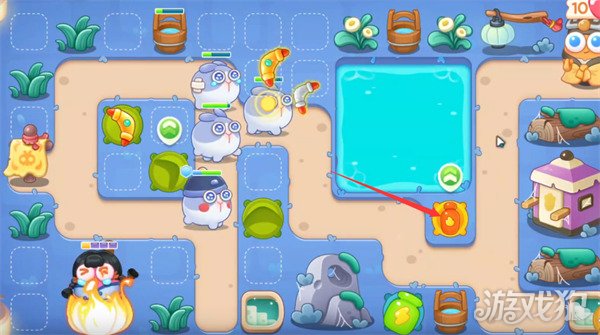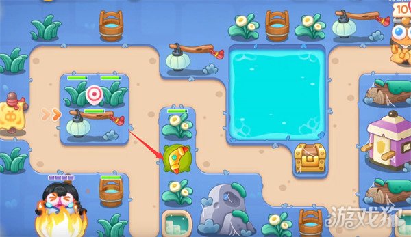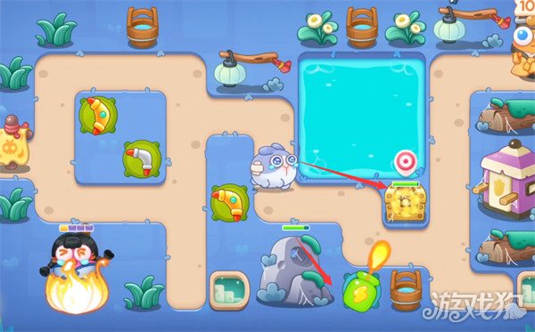 3在箭头所示位置摆放一个瓶子炮并将攻击目标选择为宝箱,快速将宝箱清掉