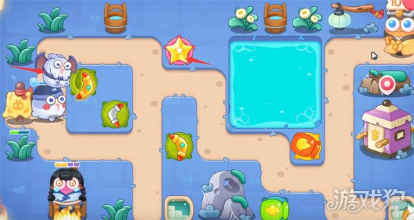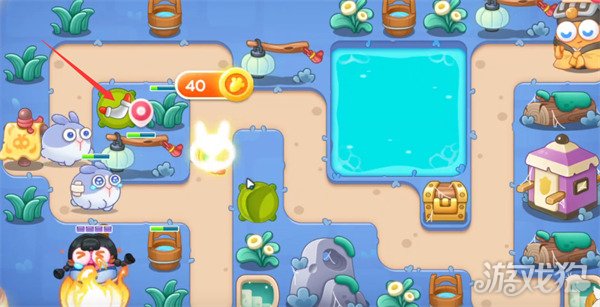 6第四波会出现会飞的兔子,此时我们需要在如图所示位置放置星星塔,及时将蝙蝠兔给击败