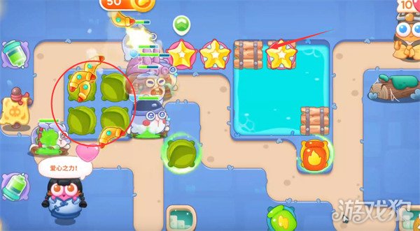 1开局在如图所示位置放置一个回旋镖并升级,回旋镖可对周围的障碍都造成伤害,方便我们快速清理障碍物