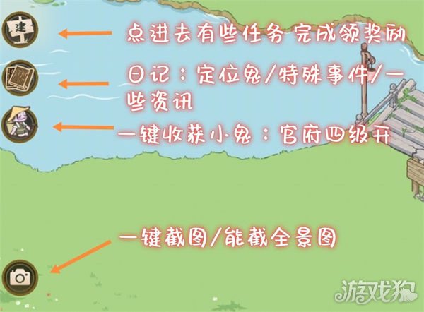 抓鬼:左侧有日记可直接定位小鬼(找鬼不愁)①收服-玩小游戏过关收服②道具收服-集市2级购买抓鬼道具