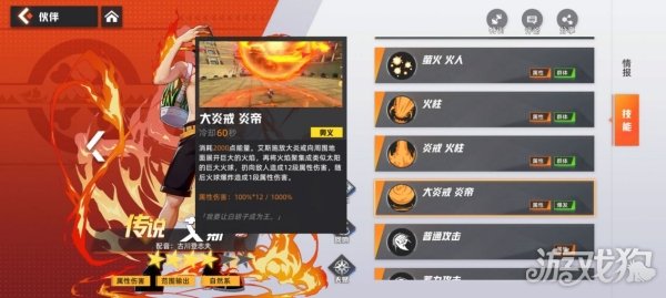 消耗2000点能量。艾斯施放大炎戒向周围地面展开巨大的火焰,再将火焰聚集成类似太阳的巨大火球,扔向敌人造成12段属性伤害,随后火球爆炸造成1段属性伤害。