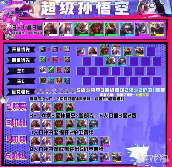 超级孙悟空是一套真正意义上的低费D卡流阵容,核心玩法是3-1搜到3星孙悟空搭配上3机甲3超级英雄即可成型。