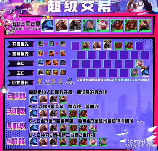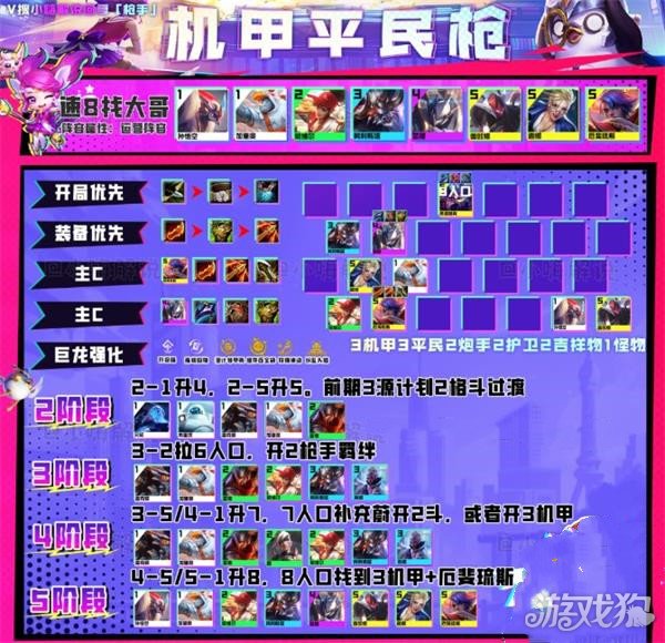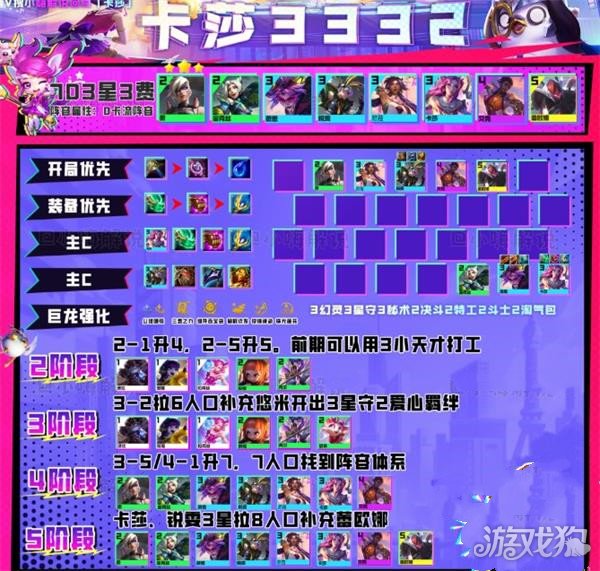 阵容运营核心在3-1大搜一费体系,以及在3、4阶段追3星阵容。阵容不需要开高人口、高羁绊,3星英雄越多后期的强度越高。
