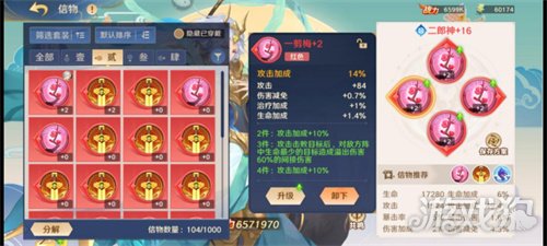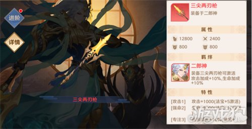 三尖两刃枪:激活即可增加二郎神10%的生命和攻击力。法宝逢5倍数进阶会触发不同效果,三尖两刃枪的进阶主要是增加面板属性,比较不同的是法宝+25的效果。