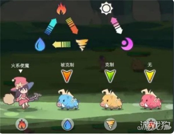 每只使魔都有自己的元素属性!其中火克制风,风克制水,水克制火,光与暗相互制约: