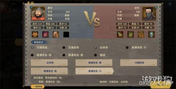 3.手动单挑:建议先选择必杀技,先对方造成大量伤害。第三回合选择闪避攻击,电脑武将一般在此时释放必杀技。掌握此技巧,同战力武将皆可击败。
