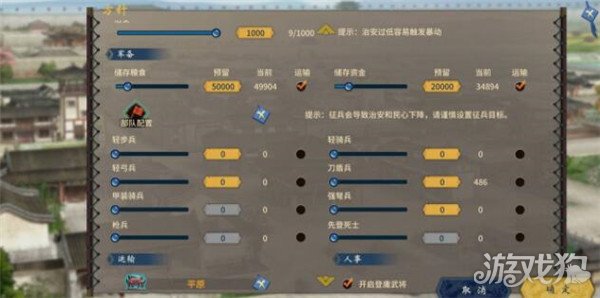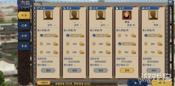 2.3政务要选择一个治安比较高的将领,因为主城要保持一直征兵状态,可以选择军事高的,因为内政可以随时中断,选择二级资金投入即可。其他的内政前期将领少,作用不大,可以不用管。