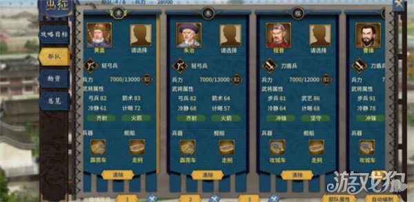 3.5前期将领少,不推荐带副将。副将影响整体属性如冷静,劫掠,生擒等。带兵数与功绩有关,将领出征,陈情,任务获得。选择的第一个将领为主帅,主帅一死则战斗失败,所以主帅一定要带弓兵 。选择两弓两步共四将,步兵带攻城车,弓兵带霹雳车(后面科技可以研发)出门资金粮食系统默认(6个月军粮),不用改。