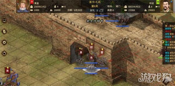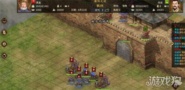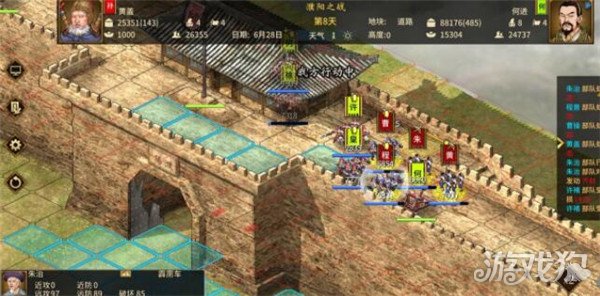3.6战斗分为自动和手动,自动战斗你所使用的器械在攻城中依然会生效,需要注意的是手动战斗中进行到月底最好选择进行内政,自动内政会使用物品。内政后如退出游戏重新进档则会自动战斗,切记要在没有战斗的时候存档退出游戏。 3.7进入战场以后,对面偶尔有将领出城,我们步兵在前,弓兵在后,很容易灭掉。步兵在距离城门五六格时选择武器放下攻城车。步弓站在五六格,防止被城墙上的弓手消耗。