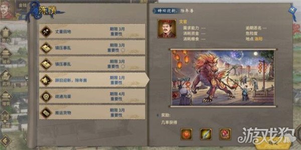 4.年兽活动:年兽活动为每年的二月份,点击陈情列表就可以参加。年兽有75万兵力,难度系数较高,玩家前期只需带领100士兵造成伤害获得红包即可。红包可赏赐给武将或者出售获得金钱。