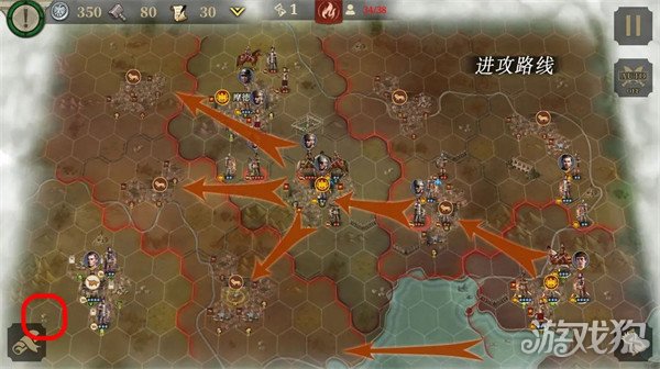 本关目标是击败6支关键部队,人口不低于25,15回合内达成目标。开局首先可以派一个精锐部队从下方海路直奔地图最左下角占领红圈村庄,可以触发剧情,盟友会牵制安东尼。正面部队按照路线逐步推进。左上角的城市还有一个关键部队不要漏掉。黄圈城有一张丛林战卷轴,可以顺路拿下。