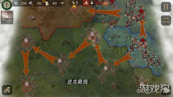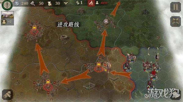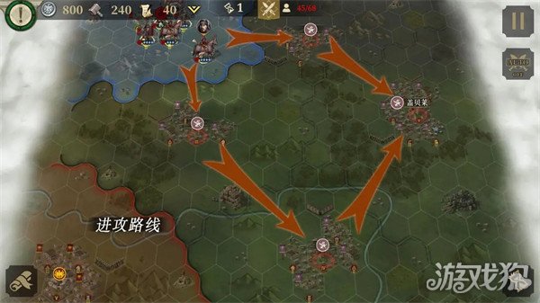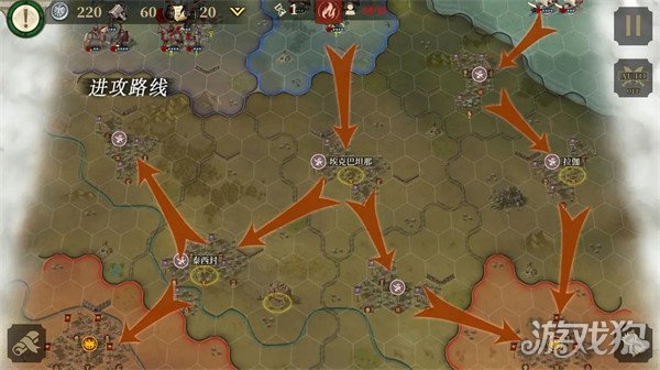 本关目标是消灭所有敌对国家,击败40支敌军部队,16回合内达成目标。本关只要占领所有敌方城市即可达成主目标。埃克巴坦纳和泰西封是5级城,优先占领,补充兵力,然后按图示路线进攻其他城市。黄圈是2张优势卷轴。
