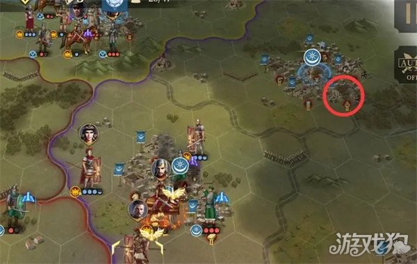 回合4:第四回合攻下城市后触发友军事件,标枪手、庞培、骑兵进攻右上角5级城(庞培站在红圈攻城,再随便配一个兵(建议骑兵)等着占城)。剩余的2个关键人物(红圈)庞培在上图红圈中的时候投矛手自己去右下角红圈杀关键点弓箭敌将。