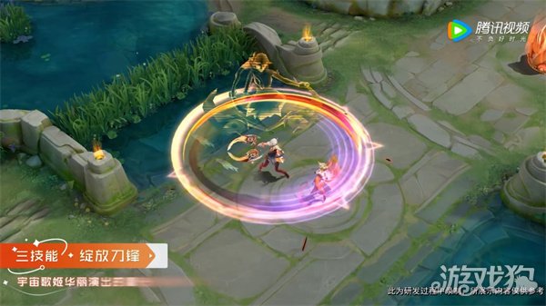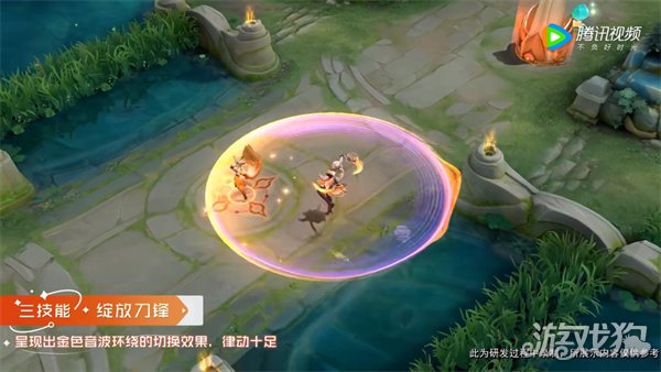 技能特效围绕轻剑、重剑两个亮点设计,重剑状态的环刃武器由两把轻剑构成,拥有绚烂的切换效果,比如大招的轻重剑呈现出金色音波的切换效果。宇宙歌姬华丽演出的高光时刻来袭:切换重剑时候,双刃组合为独特的重剑武器,红紫色彩交融绚烂夺目,充满创意的播放器呈现,力量不断喷涌。