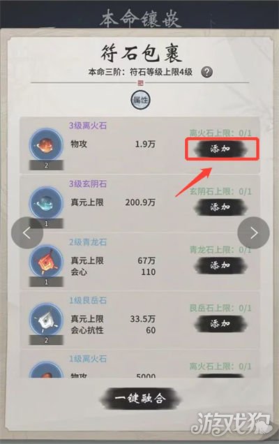 3.一念逍遥本命法宝符石第四个孔附灵符石镶嵌方法:首先本命法宝需要达到五阶,方可镶嵌第四个孔。