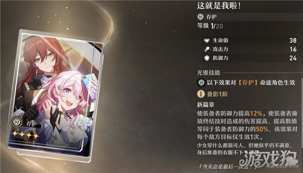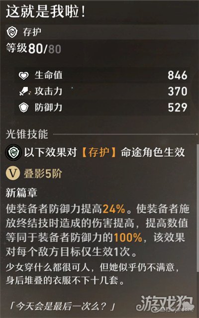 中规中矩的防御力提升,可以让根据自身防御力提供护盾的角色提供的护盾量增加。第二个被动能根据防御力提升终结技伤害,但限定了对每个敌方生效一次,有点鸡肋。