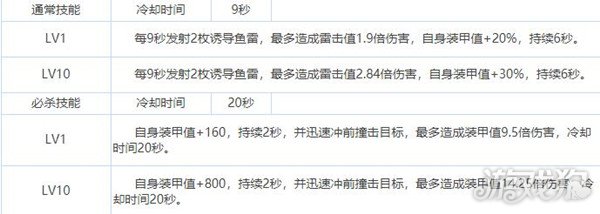 每9秒发射2枚诱导鱼雷,最多造成雷击值2.84倍伤害,自身装甲值+30%,持续6秒。