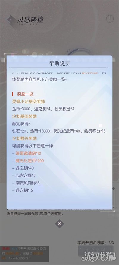 灵感碰撞:点击【灵感碰撞】,提交5次灵感小记。管理可以选择一周的任意三天开灵感,开启后协会所有成员都可以领取奖励。界面1.5版本改了,刚开服不是这样的。如果一个协会每周3次灵感都开不了,需要考虑跳槽了。跳槽优选6级及以上协会,3级及以上协会差距就不大了。